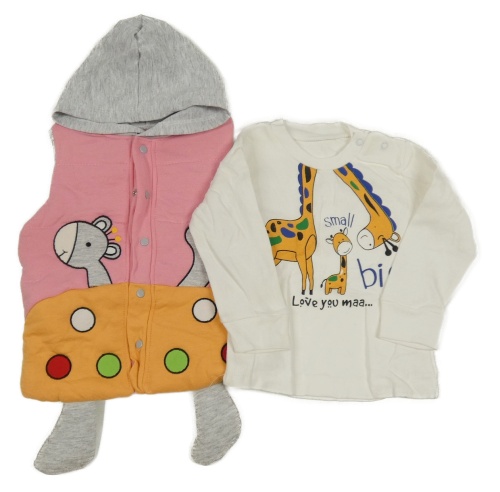 2Set - Růžovo-oranžovo-šedá prošívaná propínací zateplená tepláková vesta se žirafou a kapucí + bílé triko se žirafami