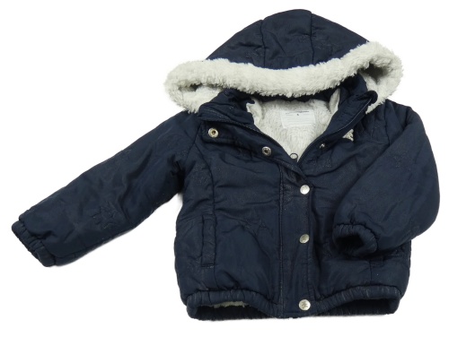 Tmavomodrá šusťáková zimní bunda s hvězdami a kapucí