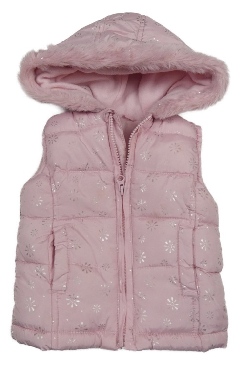 Světlerůžová vzorovaná šusťáková zateplená vesta s kapucí