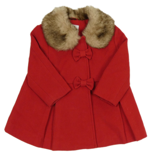 Červený flaušový podšitý kabát s mašlemi a kožešinovým límcem F&F