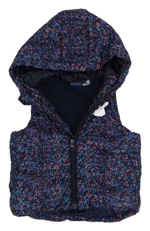 Tmavomodrá šusťáková zateplená vesta s puntíky a kapucí Lupilu