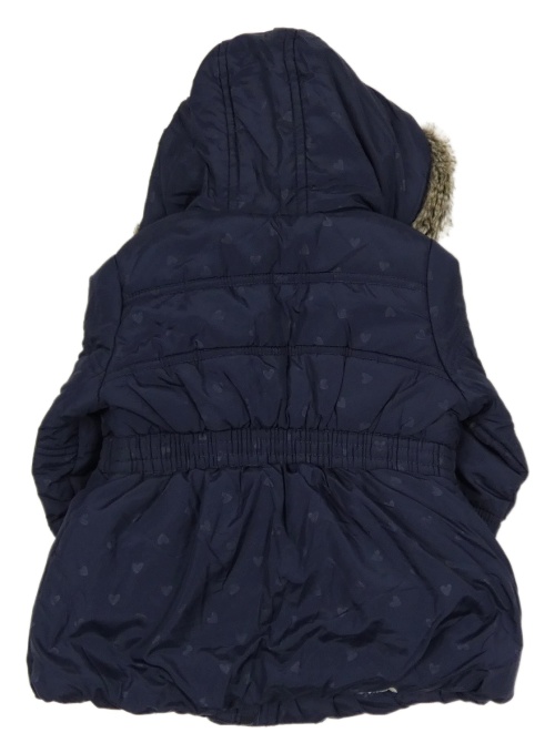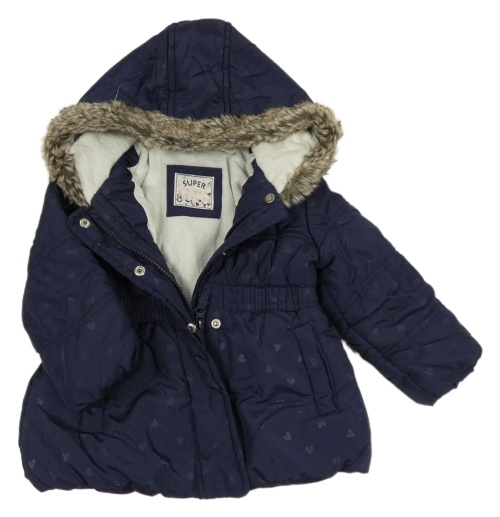 Tmavomodrý prošívaný šusťákový zimní kabát se srdíčky a kapucí s kožešinou St. Bernard