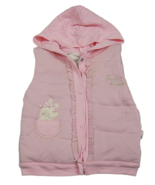 Růžová puntíkatá zateplená vesta s králíkem a kapucí