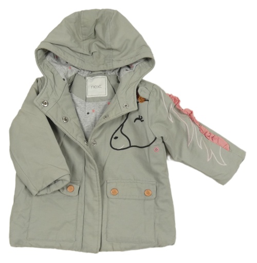 Šedá šusťáková zateplená bunda s jednorožcem a kapucí Next