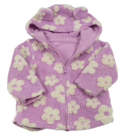 Lila-bílá květovaná huňatá podšitá bunda s kapucí s oušky St. Bernard