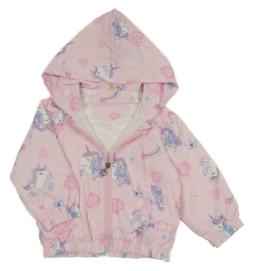 Světlerůžová lehká šusťáková jarní bunda s jednorožci a kapucí