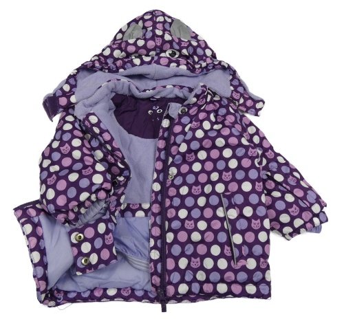 Fialová puntíkatá šusťáková lyžařská bunda s kočkami a kapucí