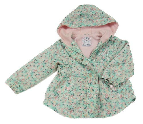 Světlezelená šusťáková jarní parka s kytičkami a kapucí St. Bernard