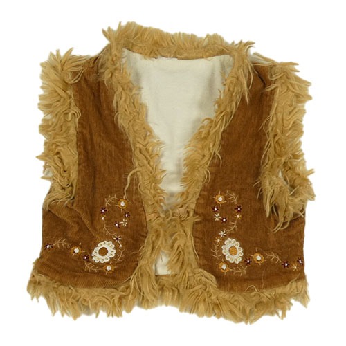 Hnědá manšestrová podšitá vesta s výšivkami květin a kožešinou