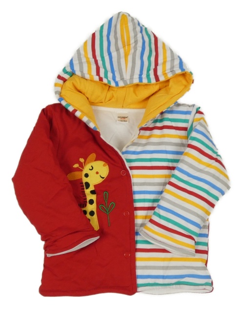 • Červeno-bílo-barevný pruhovaný zateplený kabátek se žirafou a kapucí