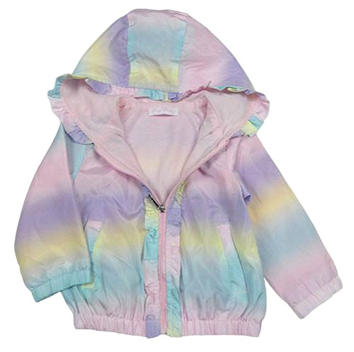 Růžovo-barevná šusťáková jarní bunda s volánky a kapucí