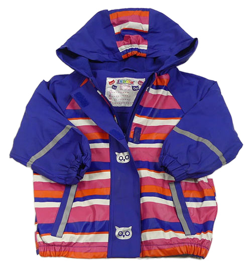 Pruhovano-tmavofialová nepromokavá podzimní bunda se sovičkami a kapucí lupilu