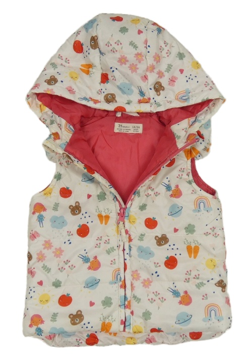 Bílo-barevná šusťáková zateplená vesta s obrázky a kapucí