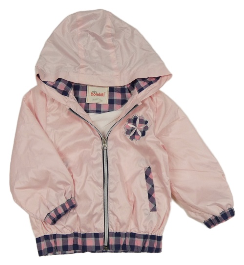 Světlerůžovo-kostkovaný šusťákový jarní bomber s květem a kapucí mini bombili