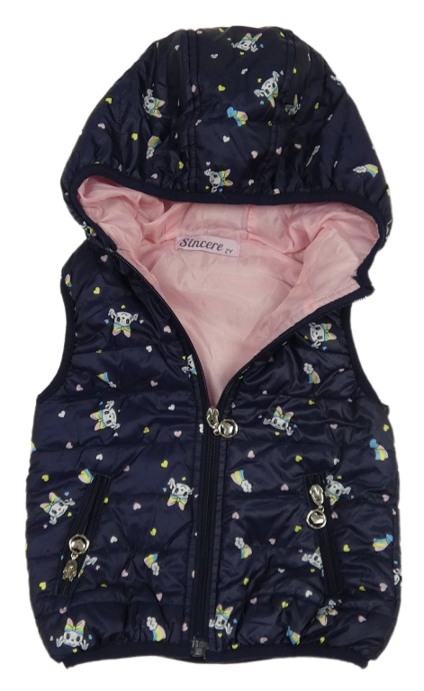 Tmavomodrá šusťáková zateplená vesta s obrázky a kapucí