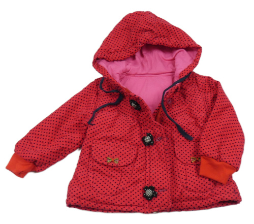 Červená manšestrová zateplená bunda s puntíky a kapucí