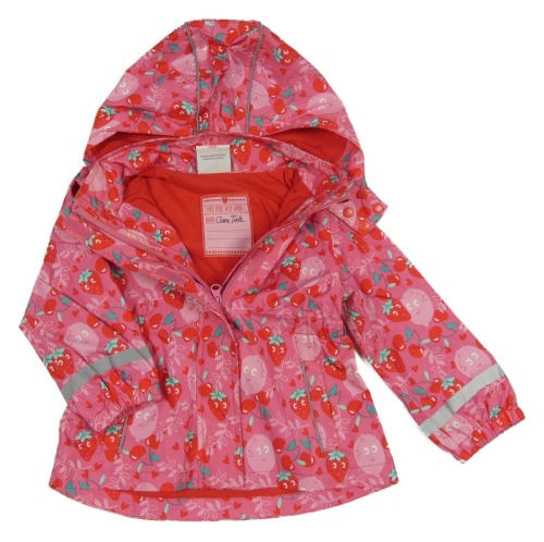 Růžová šusťáková jarní bunda s ovocem a kapucí Topomini