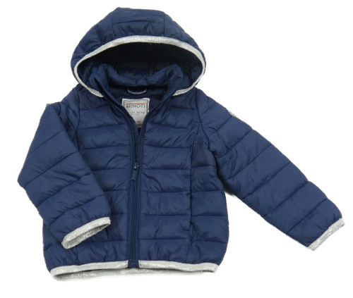 Tmavomodrá šusťáková prošívaná zimní bunda se stříbrnými lemy a kapucí Minioti