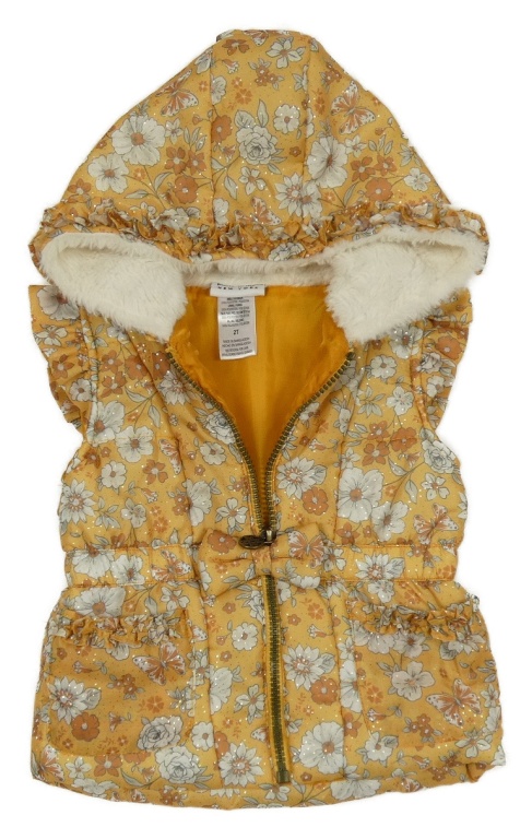 Okrová květovaná třpytivá šusťáková zateplená vesta s volánky a kapucí