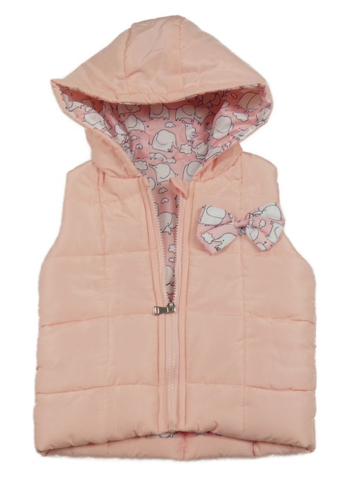 Růžová šusťáková zateplená vesta s mašlí a kapucí