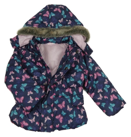 Tmavomodrá šusťáková zimní bunda s motýly a kapucí