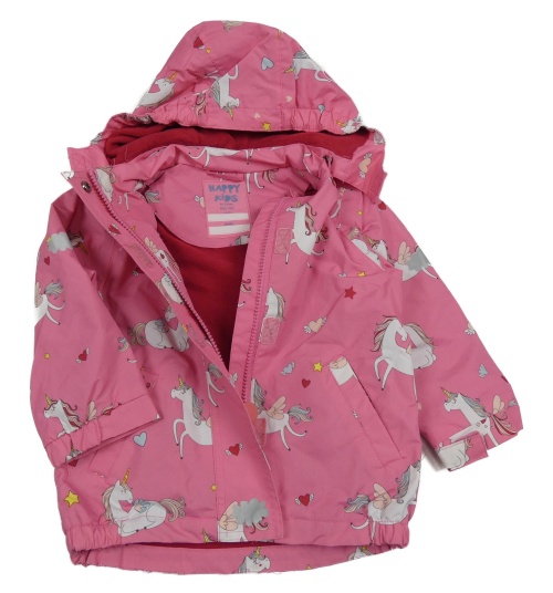 Růžová šusťáková jarní bunda s jednorožci a srdíčky a odepínací kapucí TCM