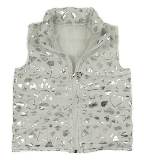 Bílo-stříbrná šusťáková zateplená vesta se srdíčky