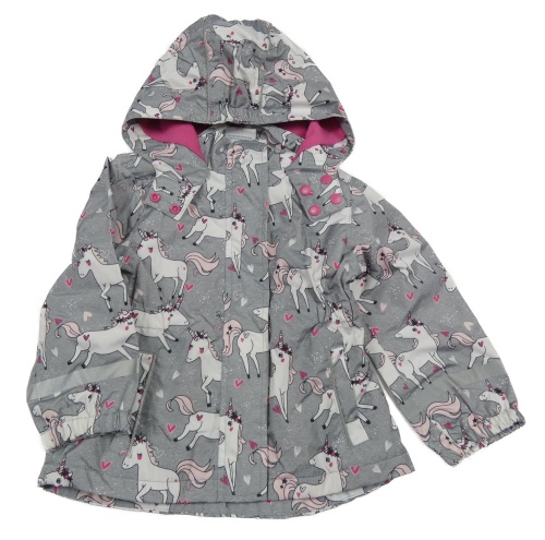 Šedá šusťáková jarní parka s jednorožci a kapucí Topomini