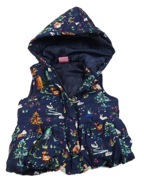 Tmavomodrá šusťáková zateplená vesta se zvířaty a kapucí