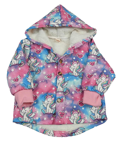 Růžovo-modrá batikovaná zateplená bunda s jednorožci a kapucí