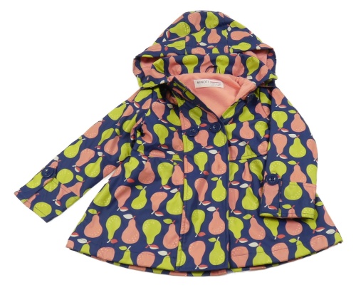 Tmnavomodro-růžovo-zelený voděodolný jarní kabátek s hruškami a kapucí