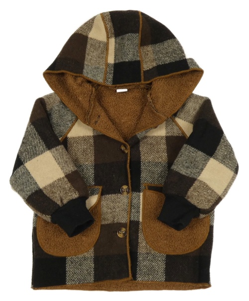 Tmavohnědo-béžovo-černá kostkovaná flaušová bunda s kapucí