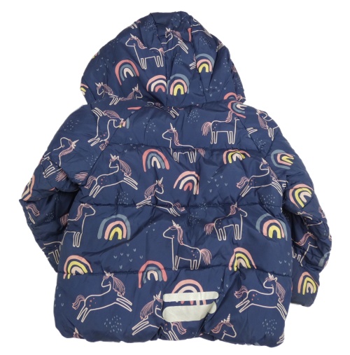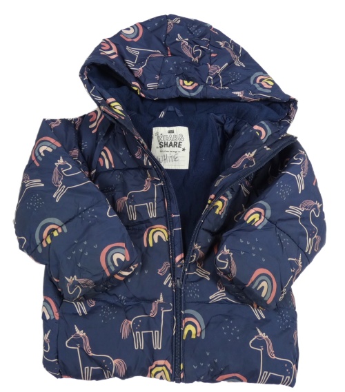 Tmavomodrá šusťáková zimní bunda s jednorožci a duhami a kapucí F&F