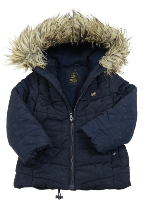 Tmavomodrá šusťáková zimní bunda s hvězdičkami, modrýlky a kapucí