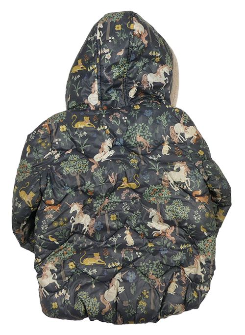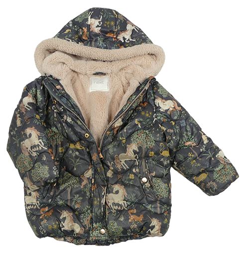 Tmavošedá šusťáková zimní bunda s jednorožci a zvířátky a kapucí Next