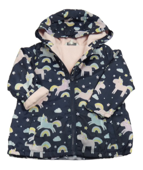 Tmavomodrá šusťáková jarní parka s jednorožci a kapucí