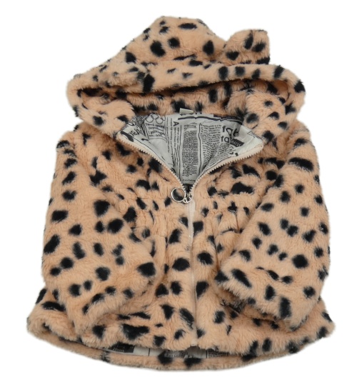 Lososovo-černý puntíkatý kožešinový podšitý kabát s kapucí