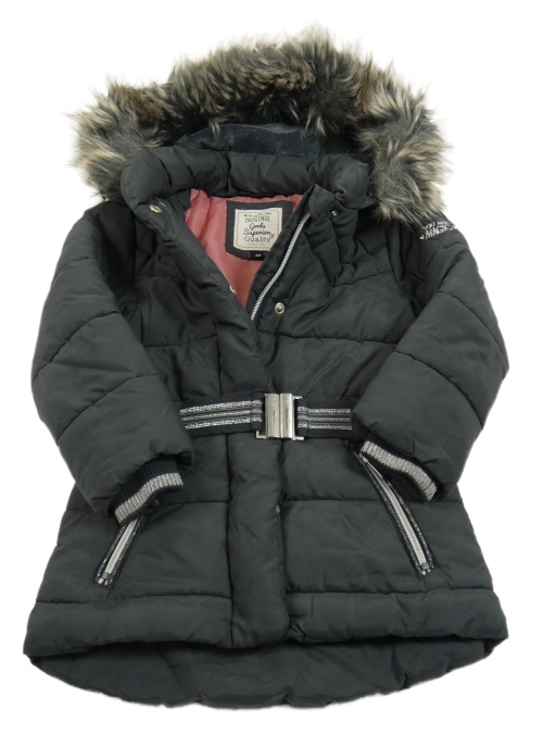 Tmavošedý prošívaný šusťákový zimní kabát s kapucí s kožešinou a páskem C&A
