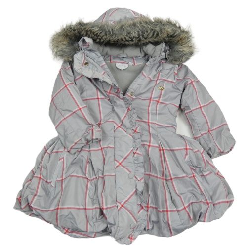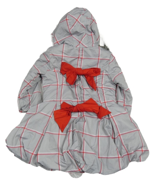 Šedo-červený kostkovaný šusťákový zimní kabát s mašlemi a kapucí