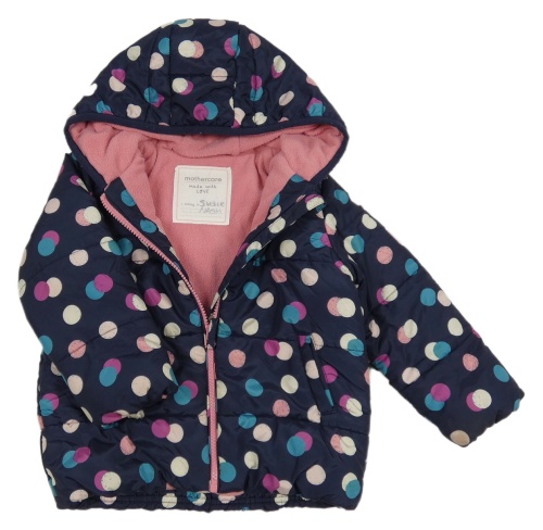 Tmavomodro-barevná puntíkatá šusťáková zimní bunda s kapucí Mothercare