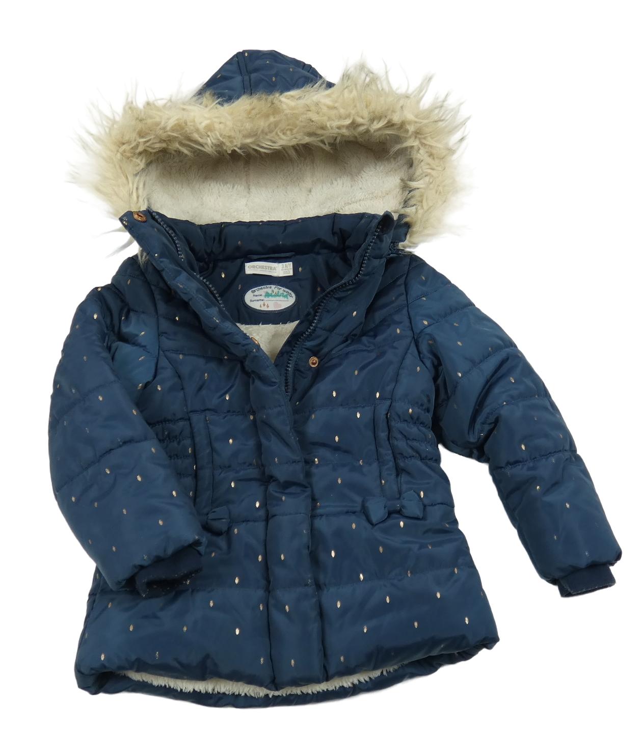 Tmavomodrá vzorovaná šusťáková zimní bunda s kapucí s kožešinou orchestra