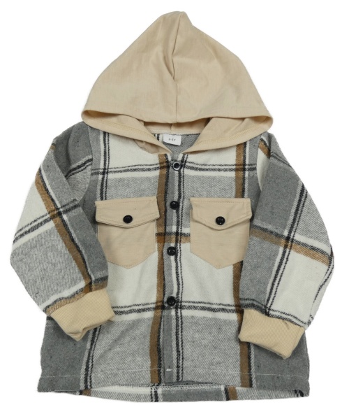 Šedo-pudrovo-bílá kostkovaná košilová bunda s kapucí