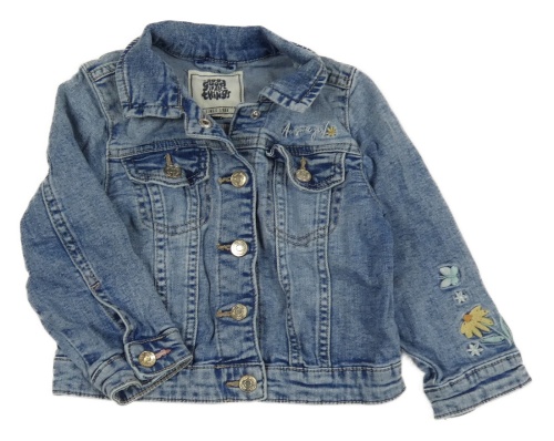 Modrá šisovaná tepláková riflová bunda s nápisem a květy a motýlkem a límečkem C&A