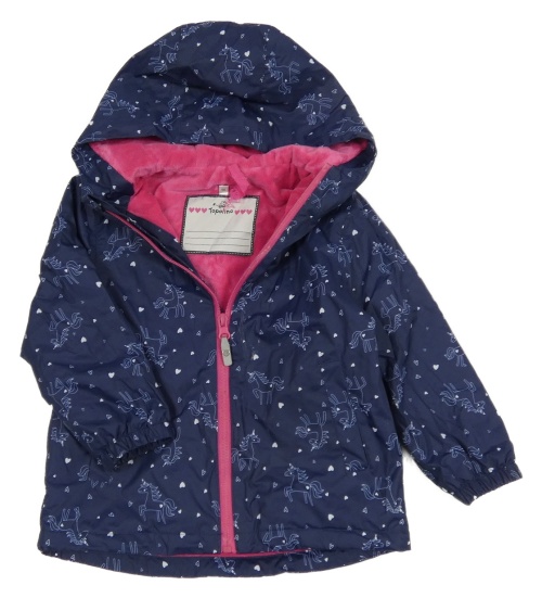 Tmavomodrá šusťáková jarní bunda s jednorožci a kapucí Topolino