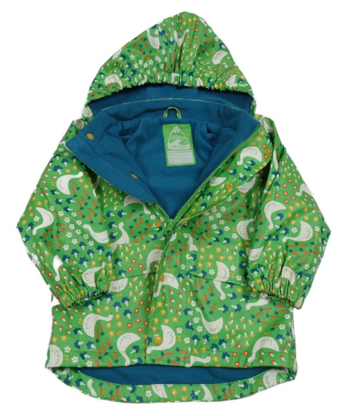 Zelená květovaná voděodolná lehce zateplená bunda s husami a kapucí Frugi
