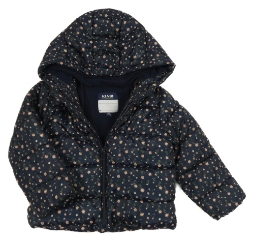 Tmavomodrá šusťáková prošívaná zimní bunda s kytičkami a kapucí Kiabi