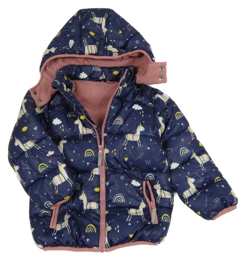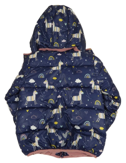 Tmavomodrá šusťáková zimní bunda s jednorožci a kapucí