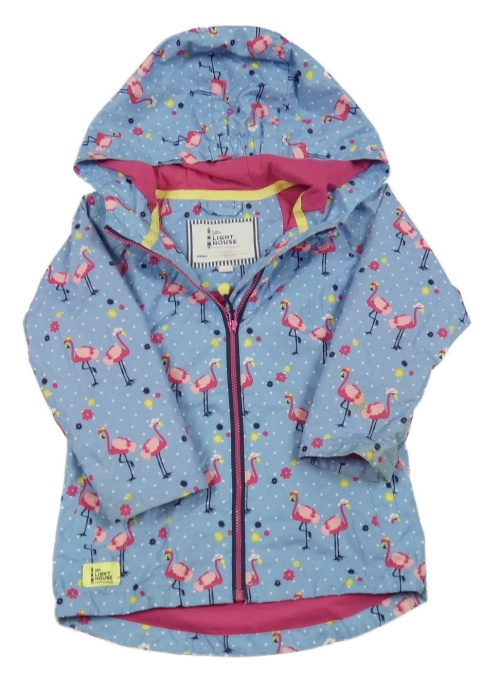 Světlemodrá puntíkatá šusťáková s plameňáky a kapucí
