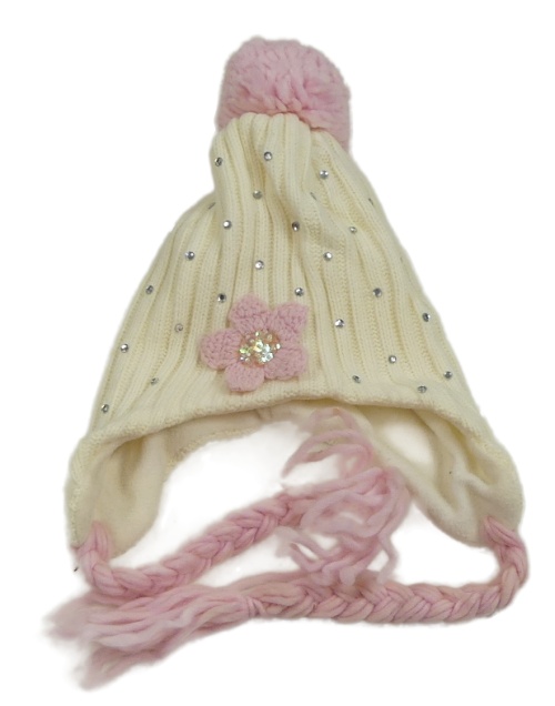 Bílo-růžová čepice s kamínky a 3D květem a bambulí