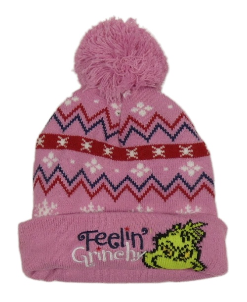 Růžová vzorovaná čepice s Grinchem a bambulí